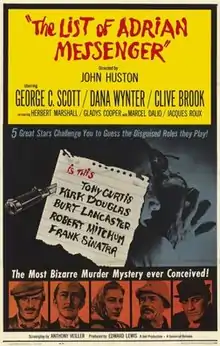 - ↑ "The List of Adrian Messenger: George C. Scott, Kirk Douglas, Tony Curtis, Burt Lancaster, Frank Sinatra, Dana Wynter, Clive Brook, Gladys Cooper, John Huston, Edward Lewis, Anthony Veiller: Movies & TV". Amazon.com. Retrieved 2016-10-10.