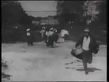 The Lost Child has been singled out by several commentators as one of the most interesting early American chase films, possibly inspired by earlier British film such as Desperate Poaching Affray. Joyce E. Jesionowski mentions it as one of the best chase films made by the Biograph Company before the arrival of D.W. Griffith, showing "a firm grasp of continuity cutting" and where "the chase is not a device that hypes the joke, it is the vehicle of the joke."[5] She furthers refers to the film as a "good example of pre-Griffith accumulation chase" where the distraught mother is joined by a line of heteroclit pursuers and where "activity is extended from background to foreground to exploit the spatial extent of the frame."[6] Finally she stresses the contribution of cinematographer Billy Bitzer in producing a "smooth passage of action from shot to shot."[7]