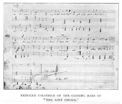 "The Lost Chord" is a song composed by Arthur Sullivan in 1877 at the bedside of his brother Fred during Fred's last illness. The manuscript is dated 13 January 1877; Fred Sullivan died five days later. The lyric was written as a poem by Adelaide Anne Procter called "A Lost Chord", published in 1860 in The English Woman's Journal.[1]