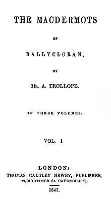 The Macdermots of Ballycloran is a novel by Anthony Trollope. It was Trollope's first published novel, which he began in September 1843 and completed by June 1845. However, it was not published until 1847. The novel was "an abysmal failure with the reading public."[1]