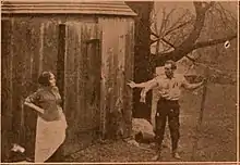 The Mad Hermit was the first film to be produced by the Thanhouser Company, but the first release was The Actor's Children.[1] The writer of the scenario is unknown. The film was shot in the autumn of 1909.[2] Edwin Thanhouser would later describe the production as, "...a rather lamentable affair. It included everything from murder through robbery and a love story. It boasted enough material for 15 plots."[1] According to Q. David Bowers, Edwin Thanhouser felt that the production had many amateurish aspects and held off on releasing the film until the reputation of the company was secured.[2] The film was directed by Barry O'Neil, the stage name of Thomas J. McCarthy. O'Neil would direct many important Thanhouser pictures, including its first two-reeler, Romeo and Juliet.[3] There are no known credits for the cast, but Anna Rosemond and Frank H. Crane are two possible actors that were prominent players in 1910.[4] Involved with the company since its beginnings, Anna Rosemond was one of two leading ladies of the Thanhouser company in this era.[5] Frank H. Crane was a leading male actor of the company and also involved since the very beginnings of the Thanhouser Company.[6] Bowers states that most of the credits are fragmentary for 1910 Thanhouser productions.[4] A later statement by Edwin Thanhouser would state that 20 persons, including the director and cameraman, were involved in the production.[1] A surviving film still leaves open the possibility of identifying two characters.[7]