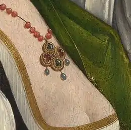Crop showing the pendant of glass beads strung on cord culminating in point-cut diamonds and rubies. Although the work is ostentatiously pious, its sensual daring, seen here in the lace opening of the underdress, indicates the new freedom available to some well-patronised artists of the early 16th century