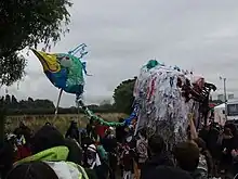 The Camp for Climate Action, also known as the 'Climate Camp' was held in Barlow, Selby, North West Yorkshire, to push for action on the issue of climate change. Over 600 people came together for 10 days to follow workshops, share skills and take action. The camp was set up near Drax power station, the largest coal fired power station in Europe and the biggest single contributor to CO2 emissions in the UK. The Mischief Makers made a giant ostrich puppet which was taken on the 'kids march' to Drax Power Station on Thursday, 31 August 2006, and seized by the police. Chief Inspector Barry Smith told the BBC "a giant home-made ostrich had been seized by police, and found to be containing tools which could have been used by demonstrators to chain themselves to fences".[27] More coverage from the Climate Camp can be found on UK Indymedia.[28]