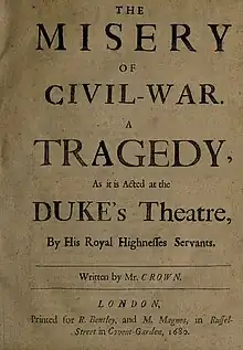 The Misery of Civil War is a 1680 tragedy by the English writer John Crowne. It was originally staged by the Duke's Company at the Dorset Garden Theatre in London. The play was staged at the height of the Popish Plot, something Crowne addressed in his prologue. Although he states that "by his feeble skill 'tis built alone, The Divine Shakespeare did not lay one Stone" the plot in fact drew heavily on Henry VI, Part 2 and Part 3 [1]