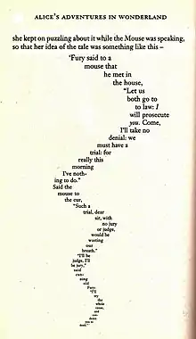 "The Mouse's Tale" is a shaped poem by Lewis Carroll which appears in his 1865 novel Alice's Adventures in Wonderland. Though no formal title for the poem is given in the text, the chapter title refers to "A Long Tale" and the Mouse introduces it by saying, "Mine is a long and sad tale!" As well as the contribution of typography to illustrate the intended pun in this title, artists later made the intention clear as well. Translators of the story also encountered difficulty in conveying the meaning there, part of which was not recognised until well over a century later.