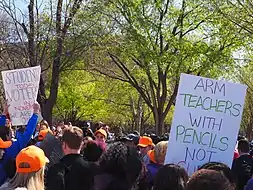 Students from over 2,500 schools participated in the walkout, taking place at 10 o’clock in the morning in each local time zone.[7] When students headed outside, they participated in 13 seconds of silence to honor the 13 people killed at Columbine High School.[2] Many walkouts consisted of the incorporation of open mics, to guest speakers and even voter registration sections; where senior students that were eligible, registered to vote.[2] Some students also wrote letters to students from other school communities that have been impacted by school shootings,[8] whereas others decided to set booths where students could call their representatives to pressure lawmakers over gun control.