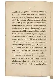 Shelley made a number of claims in Necessity, including that one's beliefs are involuntary, and, therefore, that atheists do not choose to be so and should not be persecuted. Towards the end of the pamphlet he writes: "the mind cannot believe in the existence of a God."[2] Shelley signed the pamphlet, Thro' deficiency of proof, AN ATHEIST,[2] which gives an idea of the empiricist nature of Shelley's beliefs. According to Berman, Shelley also believed himself to have "refuted all the possible types of arguments for God's existence,"[3] but Shelley himself encouraged readers to offer proofs if they possess them.
