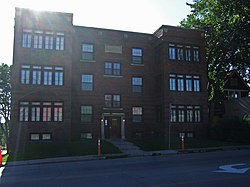 The New Lawn is a historic building located in Des Moines, Iowa, United States. This three-story, brick structure was completed in 1915. It features seven units, an U-shaped plan, a symmetrical facade with projecting wings, polychrome brick veneer, a series of quadruple ribbon windows, and a flat roof.[2] The building is located on Sixth Avenue, which by the turn of the 20th century had become a major route utilized by vehicular traffic and streetcar lines. Its proximity to this transportation corridor illustrates the emergence of higher and denser residential use in this area of Des Moines.[2] The apartment building was listed on the National Register of Historic Places in 1996.[1]