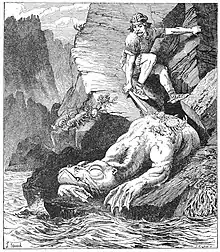 The youngest prince defeats the fierce Norka by the sea cliffs. Illustration from The Red Fairy Book.
