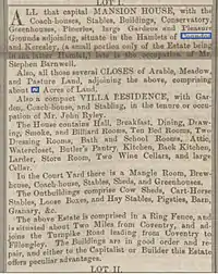 Stephen Barnwell (1810–1862) was born in 1810 in Kenilworth. He was a ribbon and lace manufacturer in Coventry. In 1836 he married Maria Augusta Oldham, daughter of Thomas Oldham of Allesley. Thomas published in 1840 a book of poetry which can be read at this reference.[7] The couple had eight children. The 1851 Census reports them as living at "Coundon Villa" with three of their children, two servants and a governess. They may have made substantial additions to the house while they were living there. In 1858 they advertised it for sale[8] and the advertisement is shown.