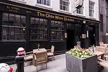The Olde Wine Shades is one of London's oldest public houses, having been built in 1663 in Martin Lane there is an oft quoted claim that it somehow survived the Great Fire of 1666. Its origins were as a Merchants house, which had a tunnel river entrance like many larger riverside properties in London at the time. The tunnel was sealed after bomb damage during the Blitz in 1940, but its entrance is still visible today. The architectural and historic significance of the Olde Wine Shades is recognised in its status as a grade II listed building.