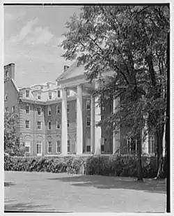 The hotel was designed by architect Percy Griffin, and built by Stephen Carlton Clark and his brother Edward Severin Clark. The hotel's architectural style has been described as both Federal and Neo-Georgian. The front of the building has a portico supported by eight 30-foot wooden columns. The kitchen was originally furnished in 1909 by Duparquet, Huot & Moneuse.[3]