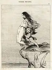 Charles Baudelaire opened "The Pagan School" with an anecdote from an event celebrating the French Revolution of 1848, where he met a young man who raised a toast to Pan and attributed the revolution to this god. At Baudelaire' inquiry, the man identified himself as a pagan and said paganism was returning after temporarily having been obscured by Christianity. He said he had seen the real gaze of Juno through an actress who portrayed her on stage. Baudelaire described the man as part of a trend of neopagans who had read too much Heinrich Heine and come to resent Christians while evoking ancient gods and celebrating beauty. According to Baudelaire, they would attribute social problems to the lack of beauty in Christianity. He used Honoré Daumier's print series L'Histoire ancienne (1842–1843), which used material from antiquity in comical and ugly ways, as a positive counter-example.