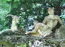 The dialogue with the neopagan references Plutarch's De Defectu Oraculorum (lit. 'On the Decline of Oracles'), a text that addresses the possibility for mortality among gods, and contains an anecdote where a mysterious voice announced that Pan had died.[13] When Baudelaire alluded to this, the young man said Pan was alive, argued that paganism contained "the true doctrines" but had been obscured by Christianity, and that it will "save the world".[14] The French studies scholar Susan Blood connects this to a technique in Christian exegesis, where gods and myths of other religions are viewed as prefigurations of Christianity, making them old and outdated once Christianity has arrived. The neopagan in "The Pagan School" used an alternative exegesis where paganism is eternally young and Christianity is the result of corruption, and thereby old. Blood says that by reversing the Christian technique of prefiguration, the neopagan added Christian characteristics to Pan and thus did not fully abolish Jesus, but used his characteristics to bring Pan to "completion".[14] Blood says "La Muse malade" similarly alludes to Christianity through its description of Pan as "le seigneur des moissons" (lit. 'the lord of the harvest').[15]
