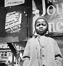 ![]() A Harlem newsboy stands in front of a poster for a series in The People's Voice (May 1943). | |