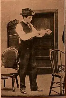 The writer of the scenario is unknown, but it was most likely Lloyd Lonergan. He was an experienced newspaperman employed by The New York Evening World while writing scripts for the Thanhouser productions.[2] The New York Dramatic Mirror points out the plot of the film resembles a popular stage production The Prince Chap from several years ago.[1] The plot of the play bear striking familiarities to the Thanhouser production. The play focuses on William Peyton, a sculptor, who takes in a young girl, Claudia, at the request of her dying mother. Claudia grows into a young woman, rejects her suitor, and concludes with Claudia and Peyton deciding to marry.[3] Another mention of this film in The Morning Telegraph stated, "This story has been told many times in pictures, excepting in this film the character is a playwright."[1] The film director and the cameraman are unknown, but the "Thanhouser Kid" Marie Eline is the only known credit in the cast.[1] Eline plays the role of the young orphan Grace. Other members cast may have included the other leading players of the Thanhouser productions, Anna Rosemond, Frank H. Crane and Violet Heming.[4][5][6] A surviving film still shows the playwright in the process of trimming his cuffs with scissors before an interview, leaving hope that another credit may be attributed to the lost film.[1]