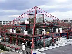 The Point is an entertainment complex in Central Milton Keynes, Buckinghamshire, England. When it opened in 1985, it was called the UK's first multiplex cinema[1][2] although the UK had introduced multi-screen cinemas in 1930 and had been increasing the number of screens in cinemas ever since. The front part of the building has a distinctive mirrored crystal ziggurat shape, framed by external steel beams at each corner, joined at the apex. Originally it had red neon lights connecting the apexes at each side, so that it looked like a pyramid at night.