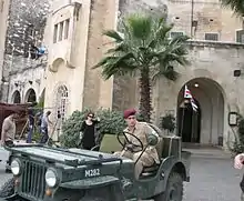 The early scene of the flat in Leeds was created in an Israeli studio.[34] Everything else was shot on location in and around Jerusalem, Haifa, Tel Aviv, Jaffa, Caesarea, Acre, Givat Brenner, Ein Hod, Peqi'in, Ramla and Beit Jimal[35] in a 68-day schedule involving 180 different locations.[33] Ben Gurion Airport stood in for Heathrow,[36] and the bombed rubble of the King David Hotel was filmed against a blue screen in a car park in Petah Tikva.[16] Part of the Old City in Jerusalem stood in for Nablus in the West Bank,[37] the Hebron-set scenes were filmed in Acre,[10] while Gaza was represented by the Israeli-Arab town of Jisr al-Zarqa.[18] The paratroopers' base at Stella Maris had been a challenge to find, but eventually the monastery at Beit Jimal was used and proved very accommodating.[38] Period military vehicles were also a challenge to source without shipping them in at prohibitive expense; the tracked armoured vehicle used in the series was an amalgam of parts from five different vehicles found in a junkyard, cobbled together into one that worked.[39] A faux Israeli checkpoint was built entirely from scratch.[27]