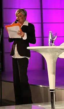 The show is written and presented by the well-known Croatian television personality, Željka Ogresta, whose husband, Dubravko Merlić (head of Castor Multimedia) conceived the format.[2] The first episode was broadcast on 31 October 2004 with opera singer Sandra Bagarić, sociologist Aleksandar Štulhofer and politician Dragan Primorac announced as the contestants.[3] According to HRT's statistics the first season averaged 61,539 callers per episode.[4] The Pyramid won a 2007 Rose d'Or award for Best Live Show,[5] and has inspired several localized versions in the region including those in Serbia (started in 2005), Bosnia and Herzegovina (started in 2007), Bulgaria (started in 2007), Macedonia (started in 2007), and Montenegro (started in 2007).[6] The Slovenian version, which started in 2006, is presented by Erika Žnidaršič and broadcast on RTV Slovenija.[7] There was also a Canadian version, La joute (The Joust), presented by Stéphan Bureau and broadcast by Télé-Québec.[8] La joute ran for two seasons but was discontinued after the 2009/2010 season when the ratings had dropped 40% from the previous season.[9]