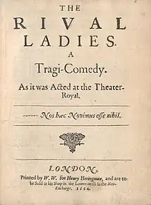 The Rival Ladies is a 1664 tragicomedy by the English writer John Dryden. It was originally performed by the King's Company at the Theatre Royal then in Brydges Street.[1] Dryden dedicated the published version to the Irish politician and playwright the Earl of Orrery.