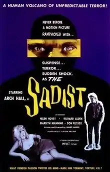The Sadist (also known as Profile of Terror and Sweet Baby Charlie) is a 1963 American exploitation film written and directed by James Landis, and stars Arch Hall, Jr. The film was distributed by Fairway International Pictures of the United States and Prima Film of Canada.
