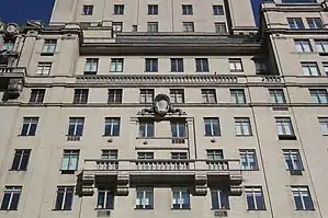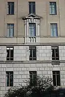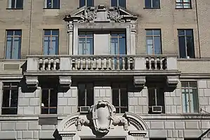 The facade contains metal, stone, and terracotta decorations.[6] These details include pilasters, engaged columns, rounded and triangular broken pediments, and balustrades, as well as smaller motifs such as roundels, scrolls, urns, cartouches, garlands, and consoles.[28] The lowest three stories of the facade are made of rusticated blocks of limestone, while the rest of the building is clad with beige brick.[28][22][21] The limestone blocks on the first and second stories are vermiculated.[28] Above the base, there is a small amount of terracotta ornament, which is used to emphasize the otherwise plain brick facade.[6][40] The ornament on the upper stories is oversized, allowing it to be seen from the ground.[40]