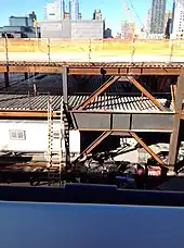 Construction of the Shed over the West Side Yard, began after caissons were sunk to support a platform over the tracks.[18] The platform supporting the towers, comprising 16 bridges, was completed in late 2014.[19] The construction of the building itself began in mid-2015.[14][20] The name of the space was changed to simply "The Shed" in 2016.[21] The retractable shell was completed by 2017.[22][23] Although early reports stated that the building would open in 2017 or 2018,[24] a 2015 report placed the opening date at 2019.[25] As of May 2017, the pace of construction indicated that the Shed was projected to open in either 2018[26] or 2019.[27]