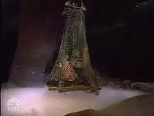 Will and Holly find themselves in the original ruins, but are soon attacked and captured by the Sleestak, who carry them into the ruins and trap them in a large net hung over a pit from which long, rasping groans can be heard. Cha-Ka finds Rick and quickly leads him to the ruins, where they are intimidated by an allosaur (dubbed earlier "Big Alice" by Holly). Meanwhile, Will and Holly escape from their net, but are recaptured by the Sleestak and placed in a new net. Rick and Cha-Ka enter the ruins and fend off the Sleestak with a torch, which accidentally falls into the pit and sets the creature within on fire.