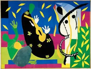 The Sorrows of the King is a collage using cut out paper shapes by Henri Matisse from 1952. It was made from paper he had coloured with gouache paint and is mounted on canvas. Its area is 292 x 386 cm. It was his final self-portrait.[1] During the early-to-mid-1940s Matisse was in poor health. By 1950 he stopped painting in favor of his paper cutouts. The Sorrows of the King is an example of Matisse's final body of works known as the cutouts.
