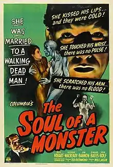 The Soul of a Monster is a 1944 American horror film directed by Will Jason and starring Rose Hobart, George Macready, Jim Bannon, Jeanne Bates and Erik Rolf.[1][2] The film involves the near-death of George Winson, leading to Anne Winson to call upon the devil to keep her husband alive, which leads to a hypnotist named Lilyan Gregg making an appearance as Winson recovers. Upon his recovery, the previously kind-hearted Winson turns evil, following Gregg's spell. But Ann and her friends are not susceptible to Lilyan's mesmerizing prowess, enabling them to launch a counteroffensive against the Dark Prince.