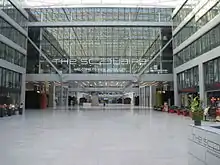 The Squaire is an office building in Frankfurt, Germany. It was built between 2006 and 2011 on top of an existing train station (Frankfurt Airport long-distance station) near Frankfurt Airport. The building is 660 m long, 65 m wide, 45 m high, and has nine floors. With a total floor area of 140,000 m2 (1,506,900 sq ft) it is the largest office building in Germany.[1][2] Its dimensions and design make it a groundscraper. The Squaire is directly connected to Terminal 1 of Frankfurt Airport through a pedestrian connecting corridor.