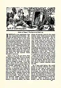![]() Title page of "The Statement of Randolph Carter" as it appeared in Weird Tales, February 1925, the second time the story was published. Illustration by Andrew Brosnatch.[1] | |