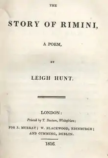 By September 1812, Hunt was busy at work on the poem and he remained there until his trial in December. He was sentenced to two years in prison, and he continued to work on the poem during that time.[5] In 1813, Lord Byron, the poet, came to visit Hunt and even brought him material on Italy that helped Hunt with his poem.[6] The poem was almost finished by the time Hunt was released from prison in 1815. To raise money to pay a 500-pound fine, he sold The Story of Rimini, The Descent of Liberty, and The Feast of the Poets to the publisher Gale, Curtis and Fenner for 450 pounds. However, Hunt did not send them the works, and the firm backed down from the deal in December 1815. In October 1816, Hunt sent portions of the work to Byron for approval, and the work was edited on the basis of his responses.[7]