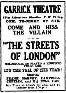 The Streets of London is a 1934 Australian film directed by F. W. Thring. It was a filmed version of a play by Dion Boucicault which Thring had produced on stage the previous year.[1] It was the last film made by Efftee Film Productions – Thring ceased production afterwards with the aim of resuming it later but died in 1936 before he had the chance.
