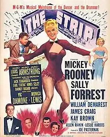 The Strip is a 1951 American crime film noir directed by László Kardos and starring Mickey Rooney, Sally Forrest and William Demarest. Much of the picture was shot on location in and around the Sunset Strip. Interiors were shot at the popular nightclubs Mocambo and Ciro's and at the restaurants Little Hungary and Stripps.[2] A large part of the film's running time consists of musical performances by the "house band," which includes Louis Armstrong, Jack Teagarden, and Earl "Fatha" Hines (all playing themselves). and by performers at other clubs, such as Vic Damone.
