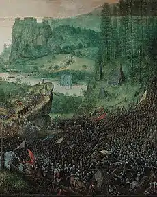 As with most of his subjects taken from the Bible, Bruegel treats Saul's suicide as a contemporary event, showing the armies in 16th century armour. In 1529, the German painter Albrecht Altdorfer had shown the clash of the forces of Alexander the Great and Darius at the Battle of the Issus in this way, and in many other respects, too, Bruegel is in Altdorfer's debt, particularly in the representation of the tiny, massed figures of the soldiers and their forests of lances.[4] Bruegel may also have looked at the battle-scenes of another German painter, Jörg Breu the Younger, and at a now lost battle-scene by the Antwerp landscape painter Joachim Patinir which is mentioned by biographer Karel van Mander.[5]