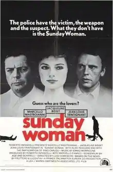 The Sunday Woman (Italian: La donna della domenica) is a 1975 Italian thriller film directed by Luigi Comencini.[1] It is based on the novel of the same name by Carlo Fruttero and Franco Lucentini. Set in Turin and starring Marcello Mastroianni, Jacqueline Bisset, and Jean-Louis Trintignant, the story covers the murders of two marginal individuals who had associated with the city's élite.