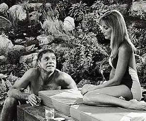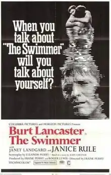 The Swimmer is a 1968 American surrealist-drama film starring Burt Lancaster.[1] The film was written and directed by Academy Award-nominated husband-and-wife team of Eleanor Perry (screenplay adaptation) and Frank Perry (director). The story is based on the 1964 short story "The Swimmer" by John Cheever, which appeared in the July 18, 1964, issue of The New Yorker.[2] The 95-minute movie adds new characters and scenes consistent with those in the original 12-page short story.