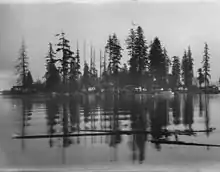 A government surveyor who was surveying the boundaries of the Bricklayer's Claim, offered a small island in the bay known as Deadman's Island (also shown on some maps as Coal Island) to Brighouse for $5, but Brighouse declined in the belief that they already had plenty of land.[3] In 1865, Morton rowed across to the island and was fascinated to find hundreds of red cedar boxes perched in the upper branches of the trees. But going to touch one of the boxes, he found it fragile and it crumbled easily, showering him with the bones of a long-deceased Indian. The boxes contained the bones of Squamish people and when Morton made enquries with the chief of the tribe, he was told that the island had been the site of a massacre in which some 200 tribesmen had been killed. Morton quickly changed his mind about buying the island.[8]