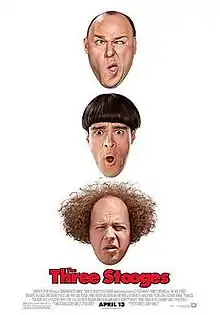 The Three Stooges (promoted as The Three Stooges: The Movie) is a 2012 American slapstick comedy film based on the 1934–59 film shorts starring the comedy trio of the same name. It was produced, written and directed by the Farrelly brothers and co-written by Mike Cerrone. It stars Chris Diamantopoulos, Sean Hayes, and Will Sasso, re-creating the eponymous characters played by Moe Howard, Larry Fine and Curly Howard.