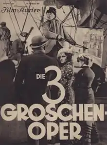 The Threepenny Opera (German: Die 3 Groschen-Oper) is a 1931 German musical film directed by G. W. Pabst. Produced by Seymour Nebenzal's Nero-Film for Tonbild-Syndikat AG (Tobis), Berlin and Warner Bros. Pictures GmbH, Berlin, the film is loosely based on the 1928 musical theatre success of the same name by Bertolt Brecht and Kurt Weill. As was usual in the early sound film era, Pabst also directed a French language version of the film, L'Opéra de quat'sous, with some variation of plot details (the French title literally translates as "the four penny opera"). A planned English version went unproduced. The two existing versions were released on home video by The Criterion Collection.