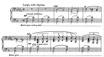 Opening bars of The Tides of Manuanuan, showing thirteen-note tone clusters. Massive clusters of 25 notes or more, to be played with the left forearm, occur later.