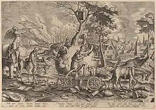 Bruegel's woodcut depicts a procession led by Time, on a chariot drawn by horses, followed by Death. On the background, life seems to continue as usual: maypole dancing, romantic couples, villagers. However, it is clear that Time and Death will catch up to all of them eventually. As Birtwistle explained, Bruegel's image is "made up of a (necessarily) linked chain of material object which have no necessary connexion with each other", which relates to his work as a "piece of music as the sum of musical objects, unrelated to each other, apart from one's decision to juxtapose them in time and space". This reflects the distinction that Bruegel creates between foreground (time passing) and background (time permanent).[2]