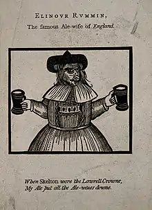 Elynour is a character in the poem who runs a "public house," or pub. In the early 16th century, the male or female owner of the pub not only sold the ale, but also probably brewed it. Elynour easily acquires all her ingredients for quite acceptable ale from the local farmers in southern England where her pub was apparently located. Nevertheless, the kind of hard language which is found in the poem, is not uncommon as "bar talk." Today, much like in the 16th century, many brands of beer have been derisively referred to as "pig piss" perhaps because of beer's pale yellowish color and its bland and very slightly bitter taste. The poet says that chickens roost over Elynour's fermentation tank and drop their excrement into the froth. The yeast will sometimes form a white cap on the fermenting beer. Alcoholic beverages are also often associated with sex and indeed will sometimes reduce the inhibitions of men and women. However, Elynour advises her female customers that the ale will make them more desirable to their husbands, in part because she has the chicken excrement in the ale. Ralph Vaughan Williams set extracts in his Five Tudor Portraits with other poems by Skelton.[1]