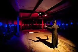 This site-responsive piece took place in Norwich Cathedral on 23 January 2017 – making extensive use of the space in a carefully choreographed promenade performance. The seating was removed from the nave to allow the performers to move freely throughout the space and to increase the effect of the lighting design.