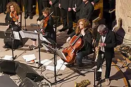 Music performed by Andy Sheppard (Tenor and Soprano Saxophone), John Parricelli (Guitar), Kuljit Bamra (Tabla and Percussion). Solo singers were Sianed Jones (Soprano), Katherine Zeserson (Alto) and Jonathan Baker (Bass). The Coutances Choir with The Voice Project Choir were conducted by Siân Croose.