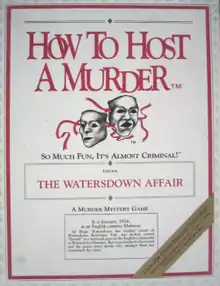 The Watersdown Affair is a mystery game in the "How to Host a Murder" series. This mystery is set in England in 1936 at the country estate of Sir Roger Watersdown. Eight players take on roles of various socialites who were all invited to spend the weekend at Watersdown Mansion.[1] The host for the party is given suggestions about what food to serve, special invitations for their guests, and suggestions for genre appropriate costumes.[2]