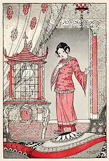 The girl finds the cage with her husband's bird-soul locked inside. Illustration by Maurice Day for Wonder Tales from Tibet (1922).