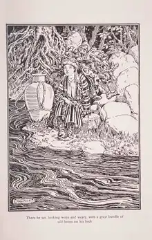 The White Bird, in human form, rests by a pond, carrying a bundle of worn out boots on his back. Illustration by George W. Hood for Fairy Tales from the Orient (1923).