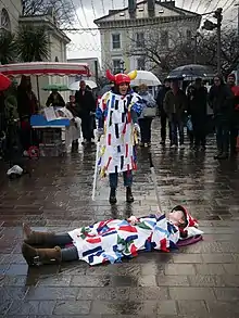 In 1975 the play was independently revived for public performance by Ross Trench-Jellicoe, Colin Jerry, Bob Carswell, David Fisher, Ian Coulson, Stewart Bennett, George Broderick, Phil Gorry and Mark Shimmin.[26] As members of the Manx dance group, Bock Yuan Fannee, they had originally planned to perform the dance only and only later came to prepare the play also.[27] Although a complete rewrite of the play was prepared by Stewart Bennett to address contemporary politics, the version eventually performed was an amalgamation of the 1832 and 1845 versions, with other slight additions.[27] On the last Saturday before Christmas 1975 they performed the play concluding with the sword dance at fourteen locations all over the Isle of Man.[28]